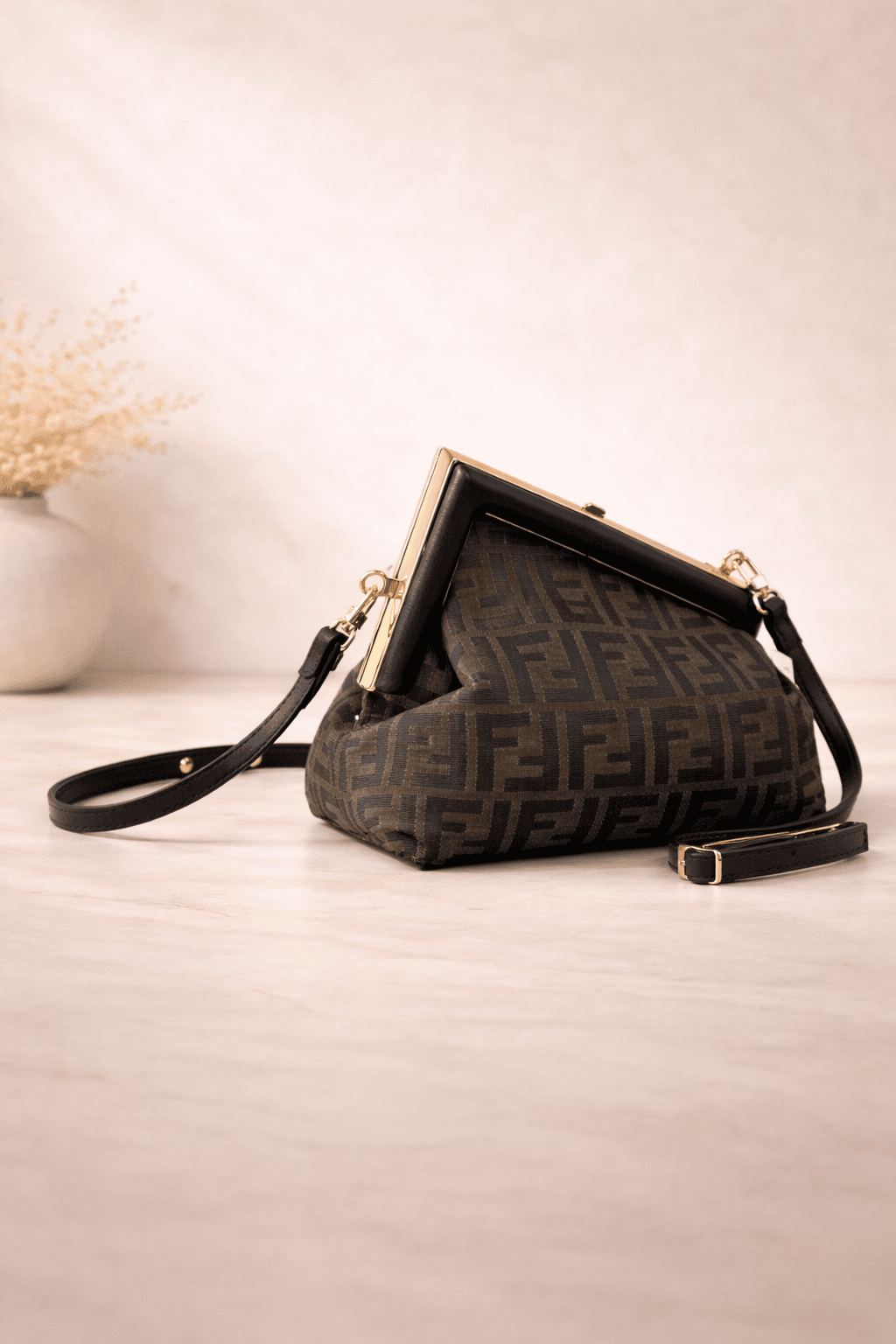 Fendi First Small, markanın en ikonik ve modern çanta modellerinden biridir. Yumuşak deri yapısı ve karakteristik eğimli metal çerçevesi ile dikkat çeker.